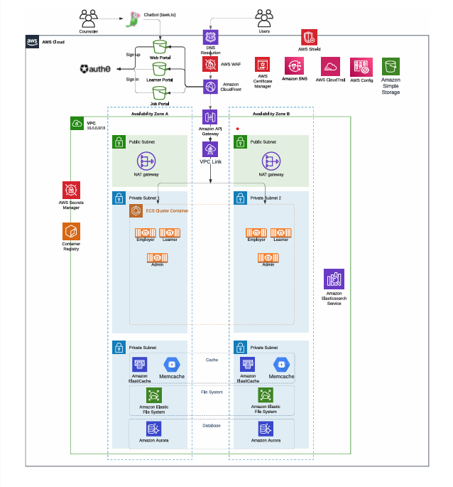 Nammiskills is the go-to platform to drive learners' careers forward using targeted learning activities based on the most in-demand jobs. Nammiskills aims to create learning journeys and pathways for people wanting to learn new skills that will help them find job opportunities in today's ever-digitalized labor market. Developed with the support of UNICEF and the World Bank, our platform is designed to help users achieve their career goals and maximize their earning potential, in partnership with leading tech companies. Since Nammiskills was going to be released in the MENA region, our biggest challenges were scalability, latency and security. To address these concerns, we adopted the Serverless approach, using Amazon API Gateway for publishing API's, Elastic Load Balancer, Aurora RDS Amazon ECS Fargate for the backend. Additionally, AWS Config was implemented across the multi-account environment to continuously monitor resource configurations and ensure alignment with Nammiskills’ security and compliance requirements as the platform scaled.