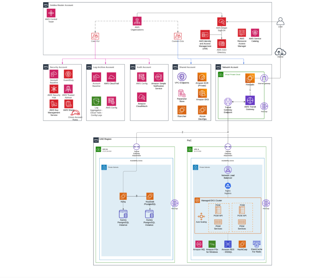 The entire architecture was anchored in a secure Landing Zone configured through AWS Control Tower, split into specialized accounts for Networking, Security, DevOps, Logging, and Production. Preventive and detective Guardrails were configured to enforce compliance with PCI DSS and internal policies — including region-specific access restrictions, encryption at rest, and network control boundaries. This end-to-end deployment enabled Geidea to consolidate and modernize its environments, enforce governance across multiple regions, and achieve scalable, secure operations with built-in compliance from day one. To ensure governance and secure access, the solution established a master account retained by Geidea, while delegated administrative access was granted to a central hub account. Although not under MSP, Zero&One supported account structuring, Control Tower setup, and access policies through enablement sessions with Geidea's team.